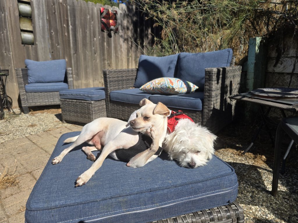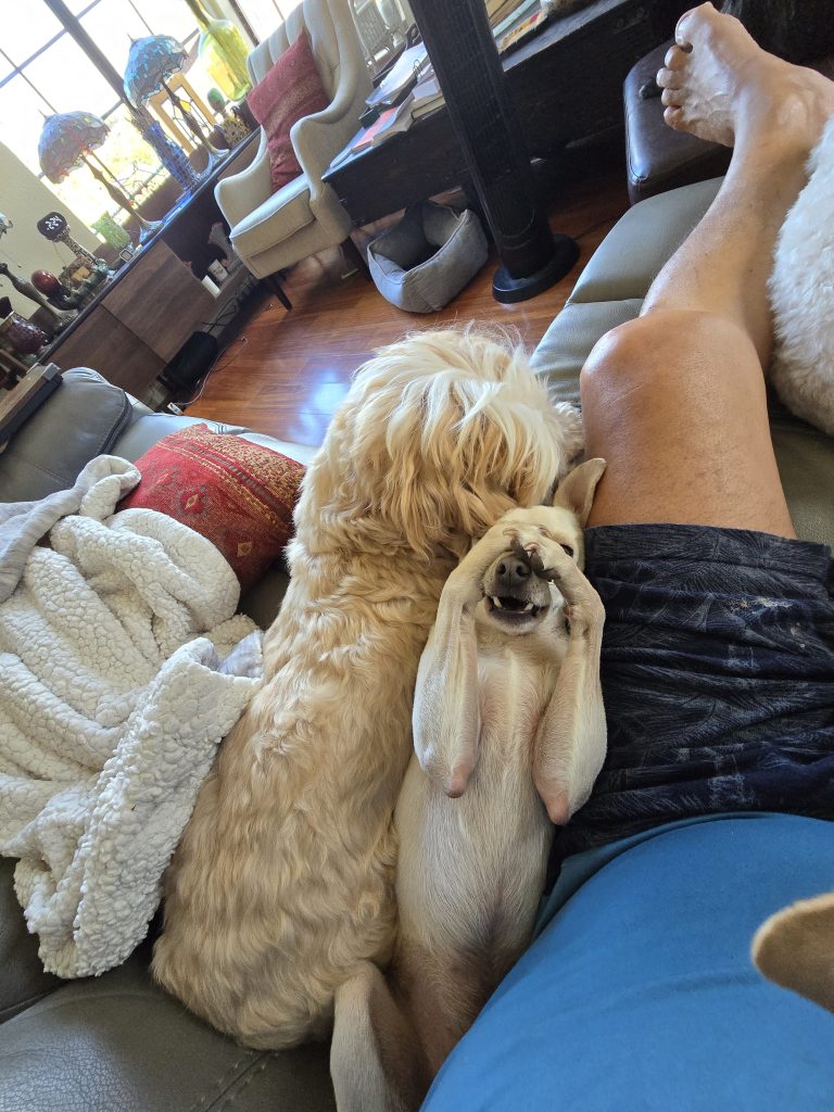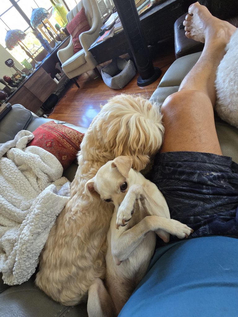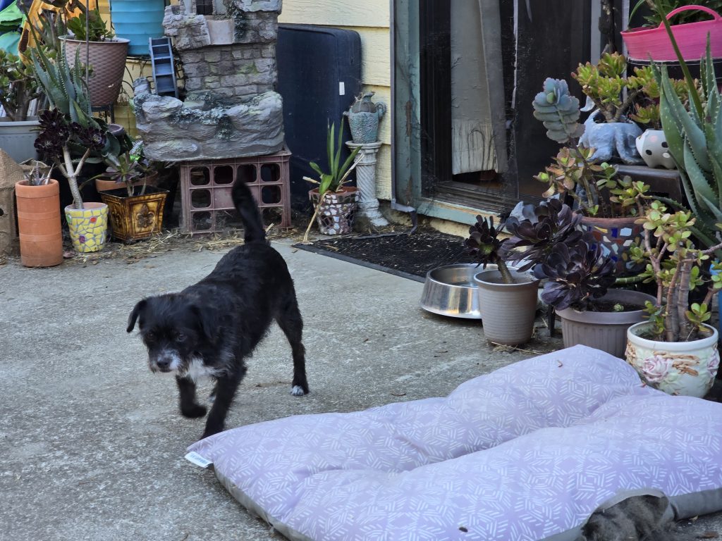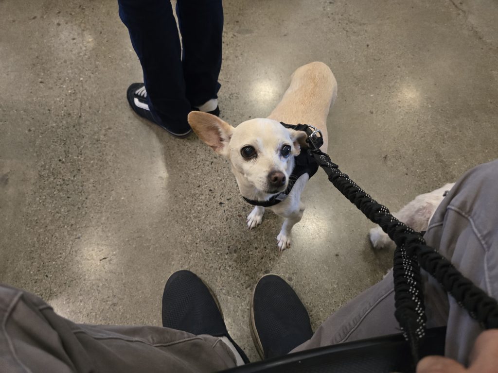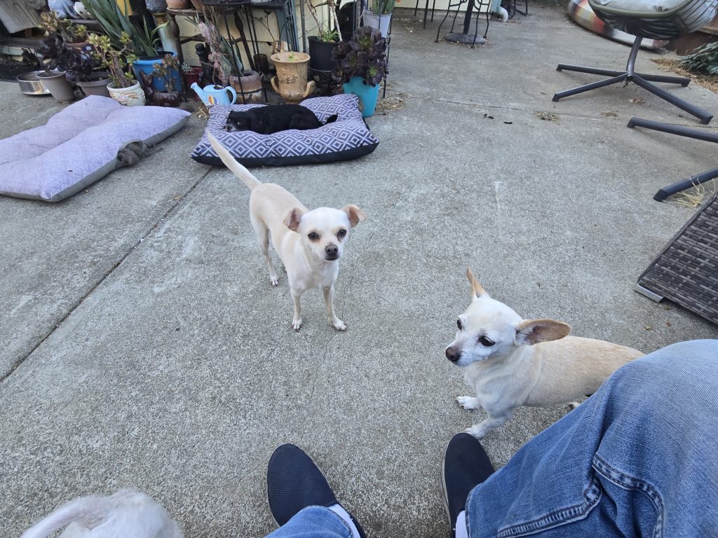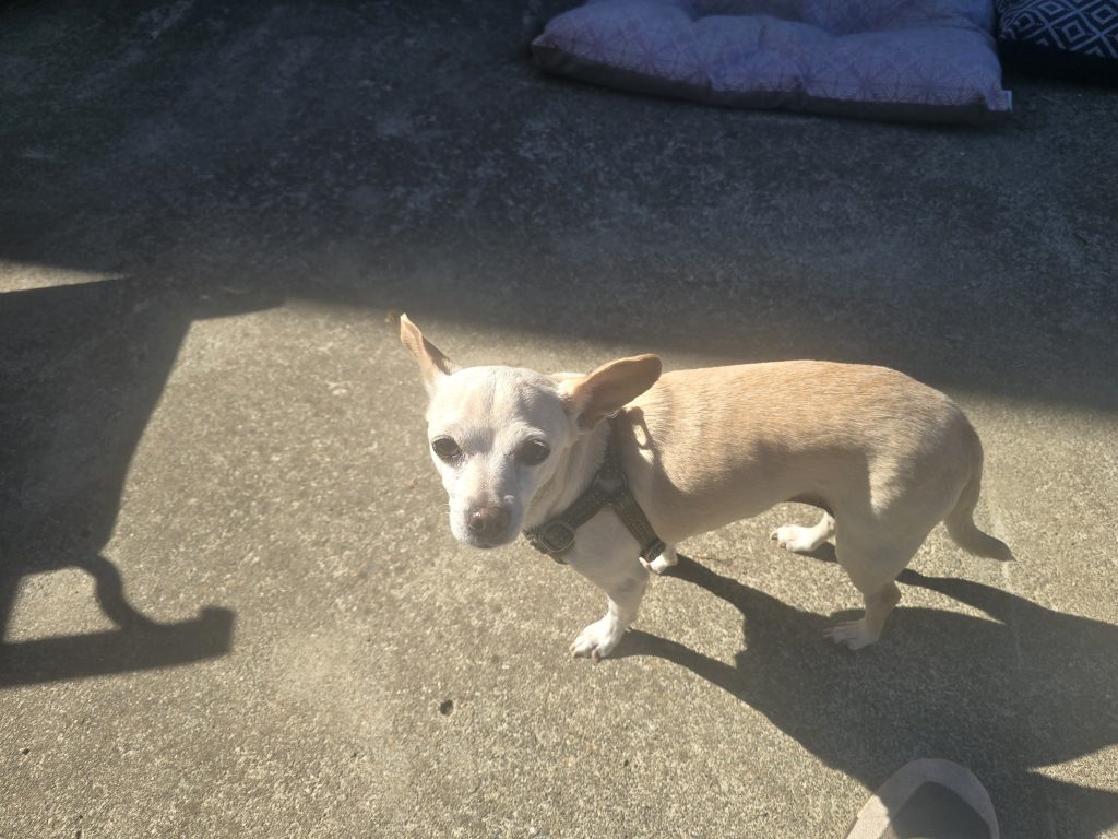 At the shelter I saw a quivering senior whose microchip says she is well over 12 years old in a crate. She was very sweet and will likely get transferred to Muttville, so I offered to take her home and give her a quieter place to rest until such time as she will hopefully be accepted there. Lana’s former guardians either didn’t want her or something happened to them. I was SHOCKED at how similar she looks to our foster Marshall. I literally would not be surprised if she is his grandmother or great-great-great-grandmother, possibly.