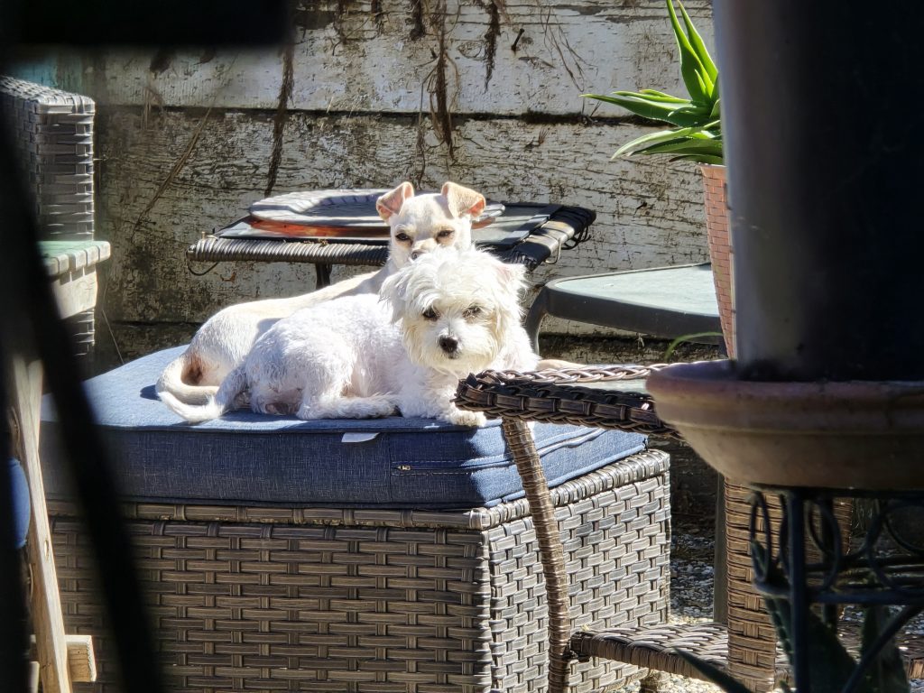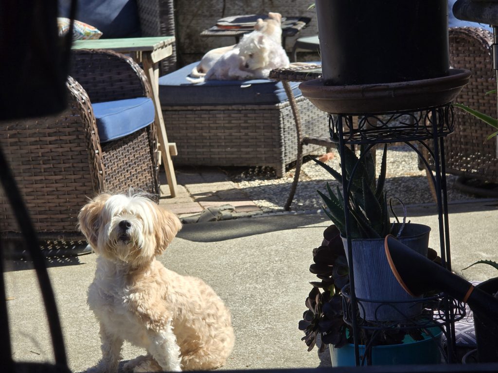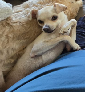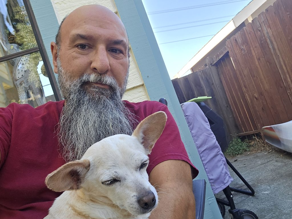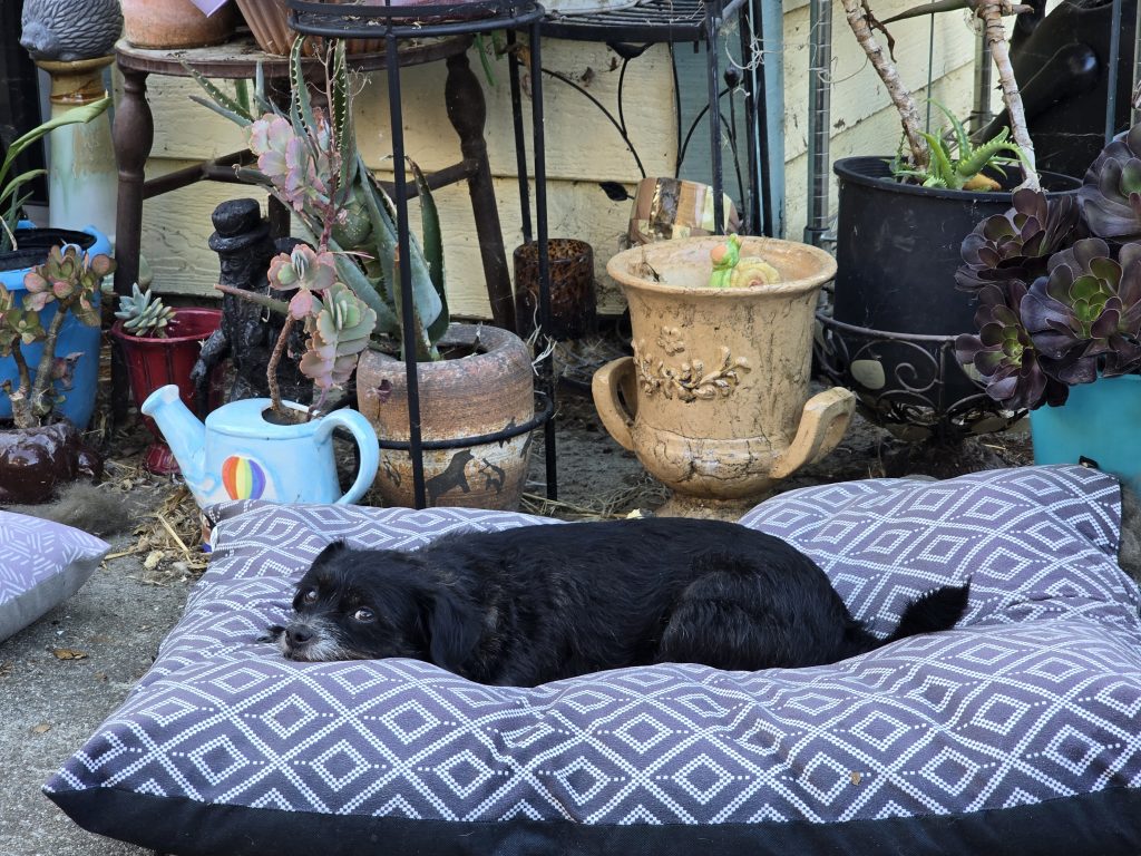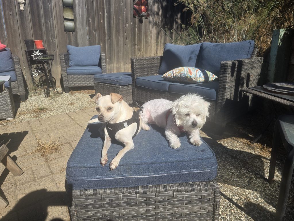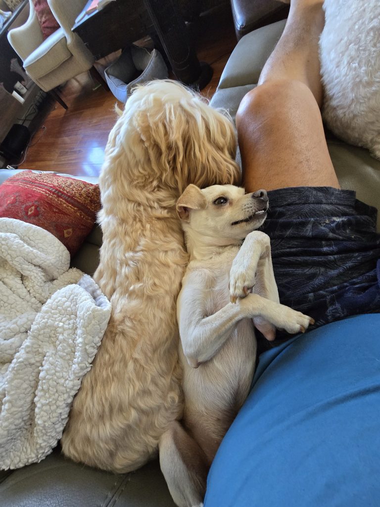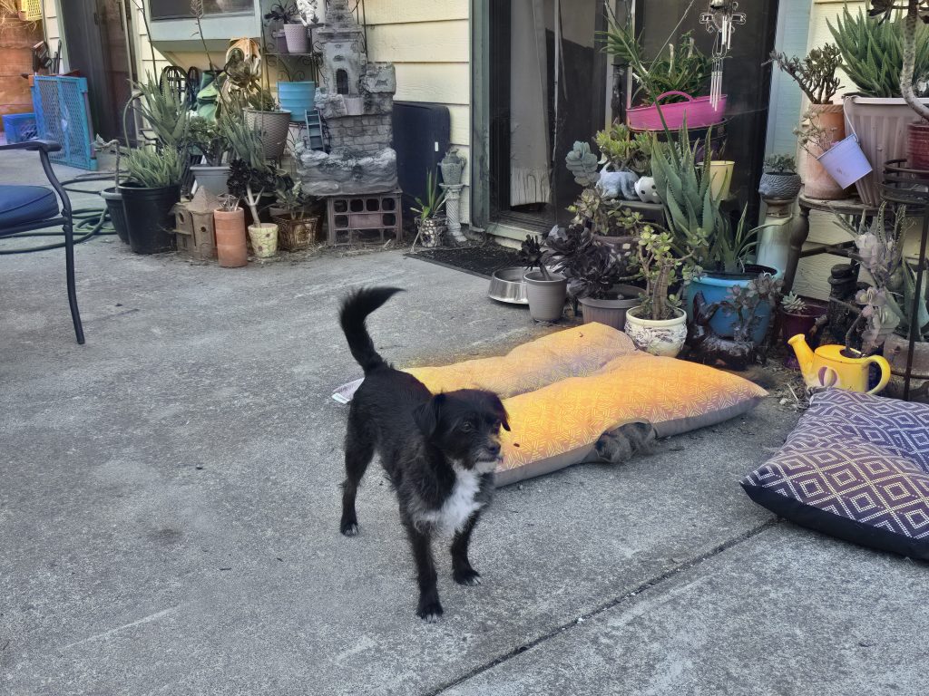At the shelter I saw a quivering senior whose microchip says she is well over 12 years old in a crate. She was very sweet and will likely get transferred to Muttville, so I offered to take her home and give her a quieter place to rest until such time as she will hopefully be accepted there. Lana’s former guardians either didn’t want her or something happened to them. I was SHOCKED at how similar she looks to our foster Marshall. I literally would not be surprised if she is his grandmother or great-great-great-grandmother, possibly.