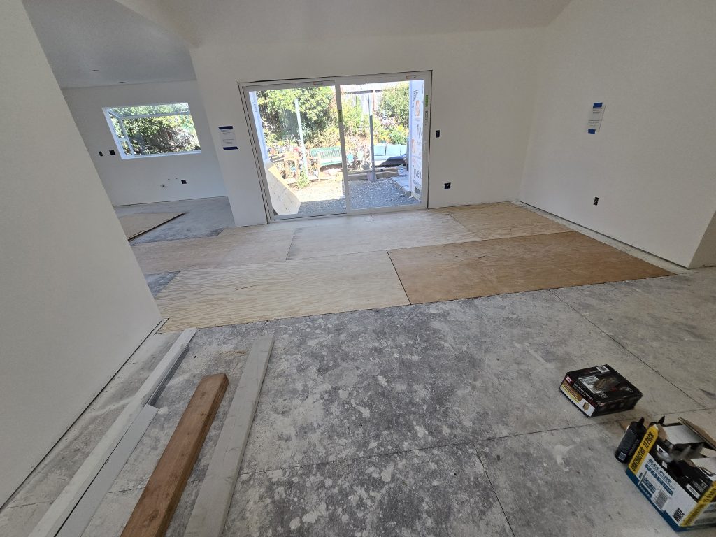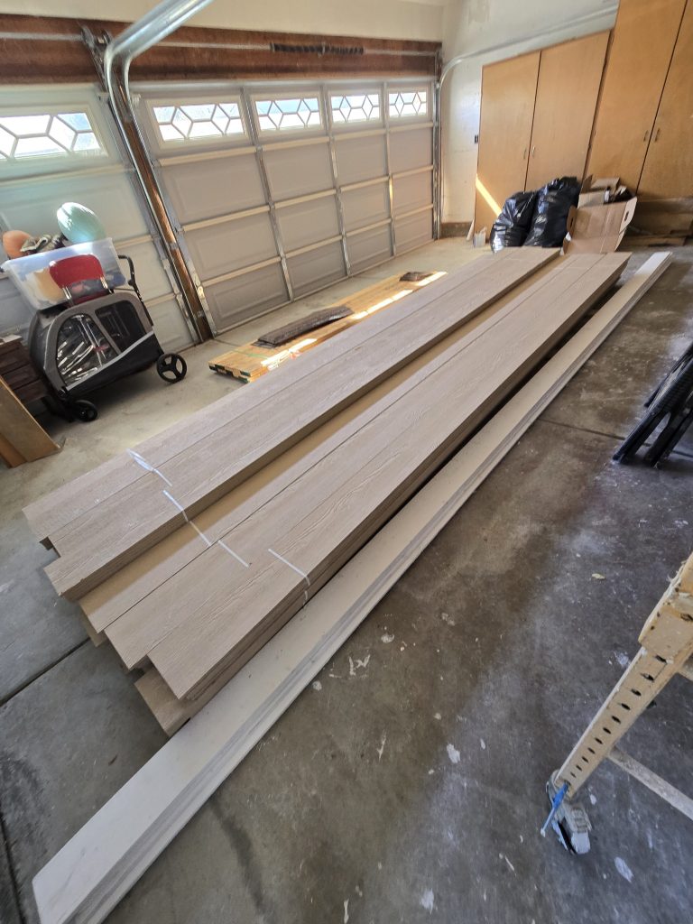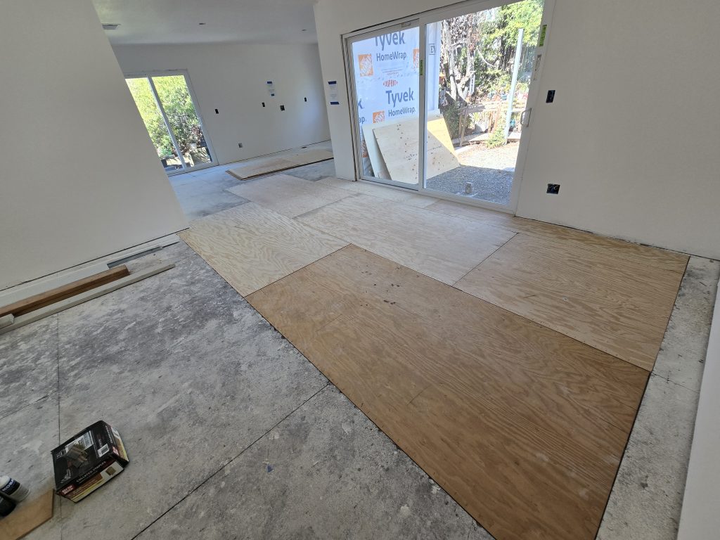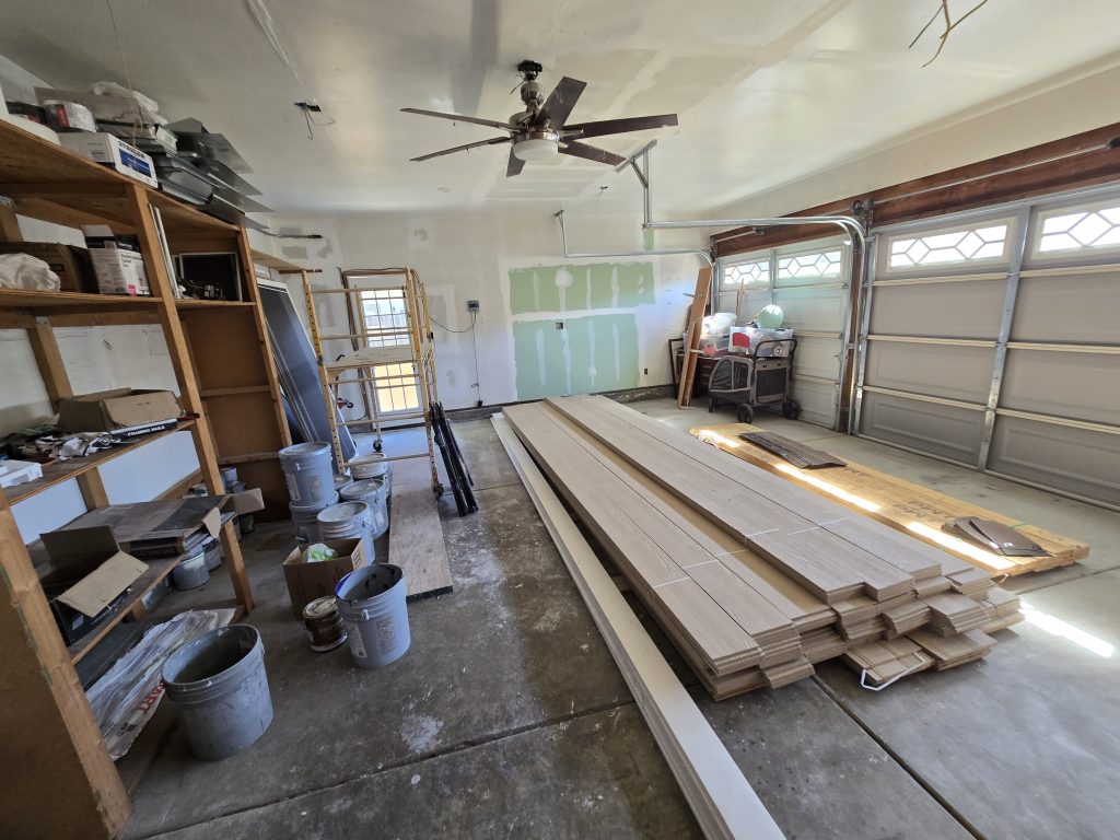 We thought the floors were being installed, but it looks like some of the pieces of the subflooring were just being replaced. What’s staged in the garage might be flooring or more siding. It’s hard to tell.